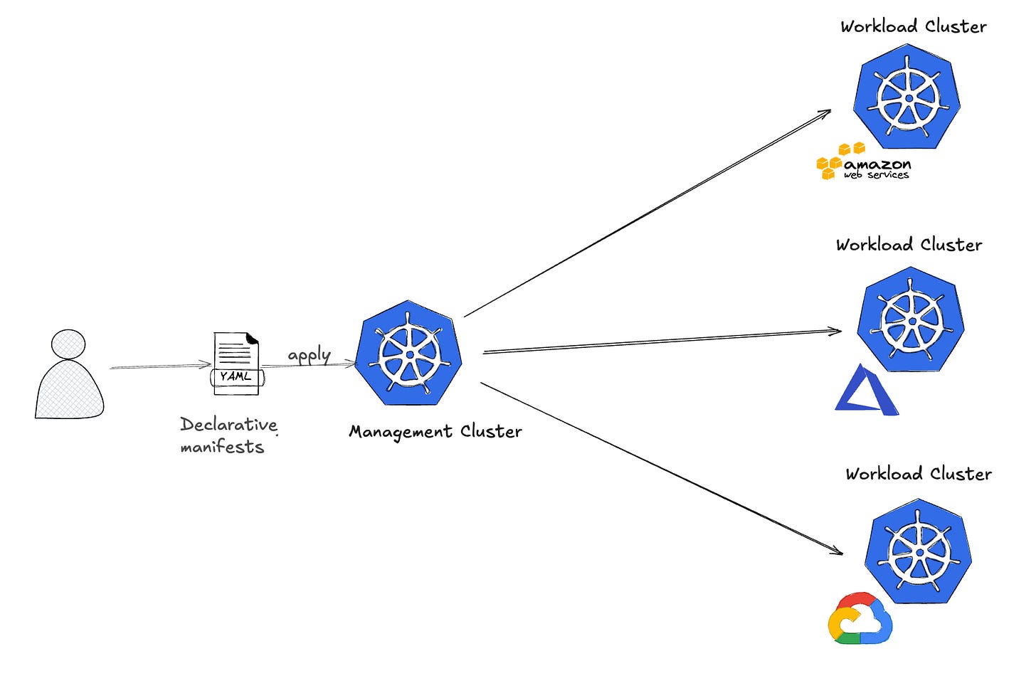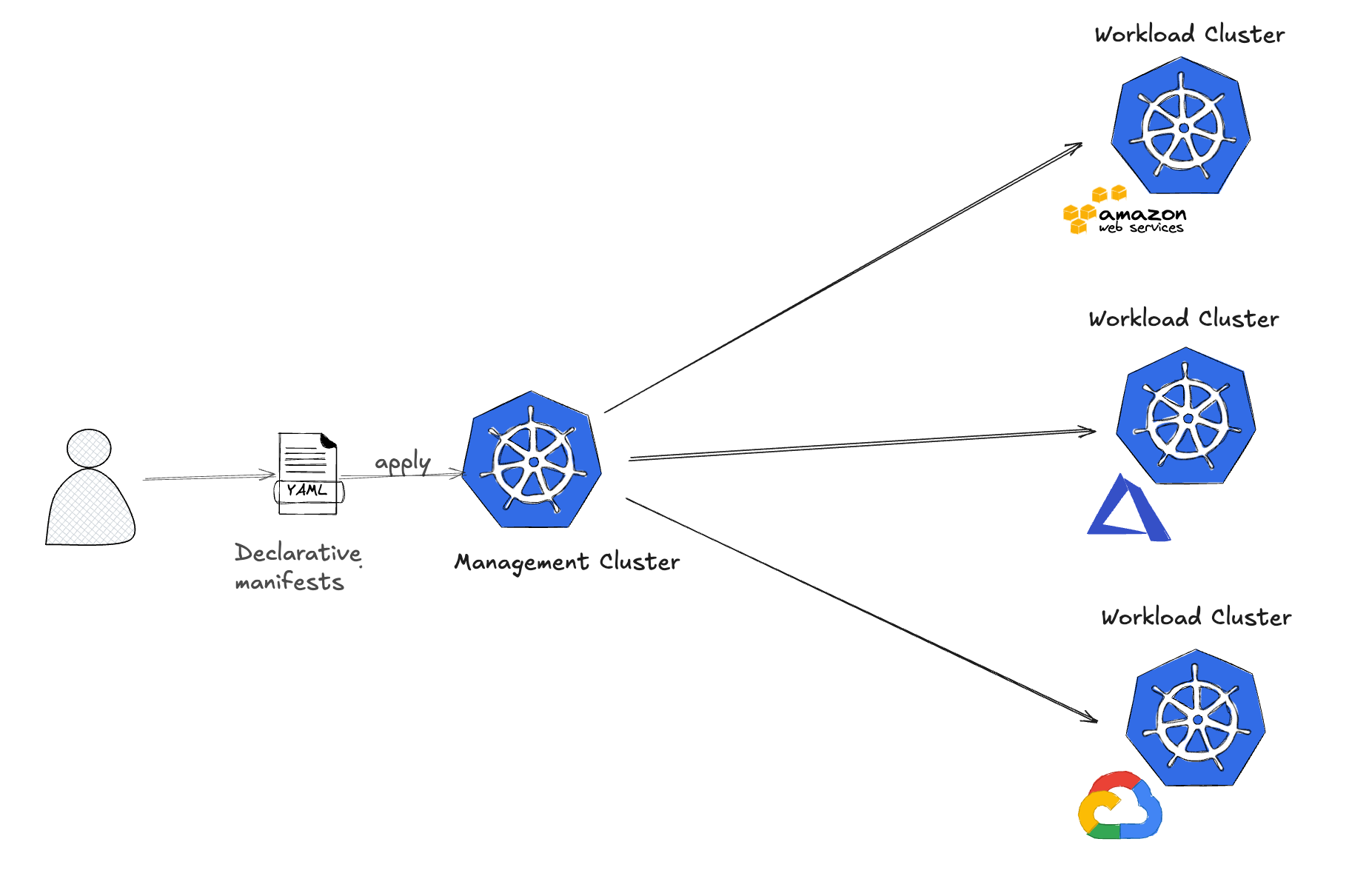 The main idea of Cluster API is to use Kubernetest to manage Kubernetes, what it means here is that you can use the same declarative k8s-style APIs to manage other k8s clusters. Imagine that instead of running kubectl apply … to create and manage pods, deployments or services, now you can do the same to create a fully k8s cluster on a cloud provider or an on-prem infrastructure.