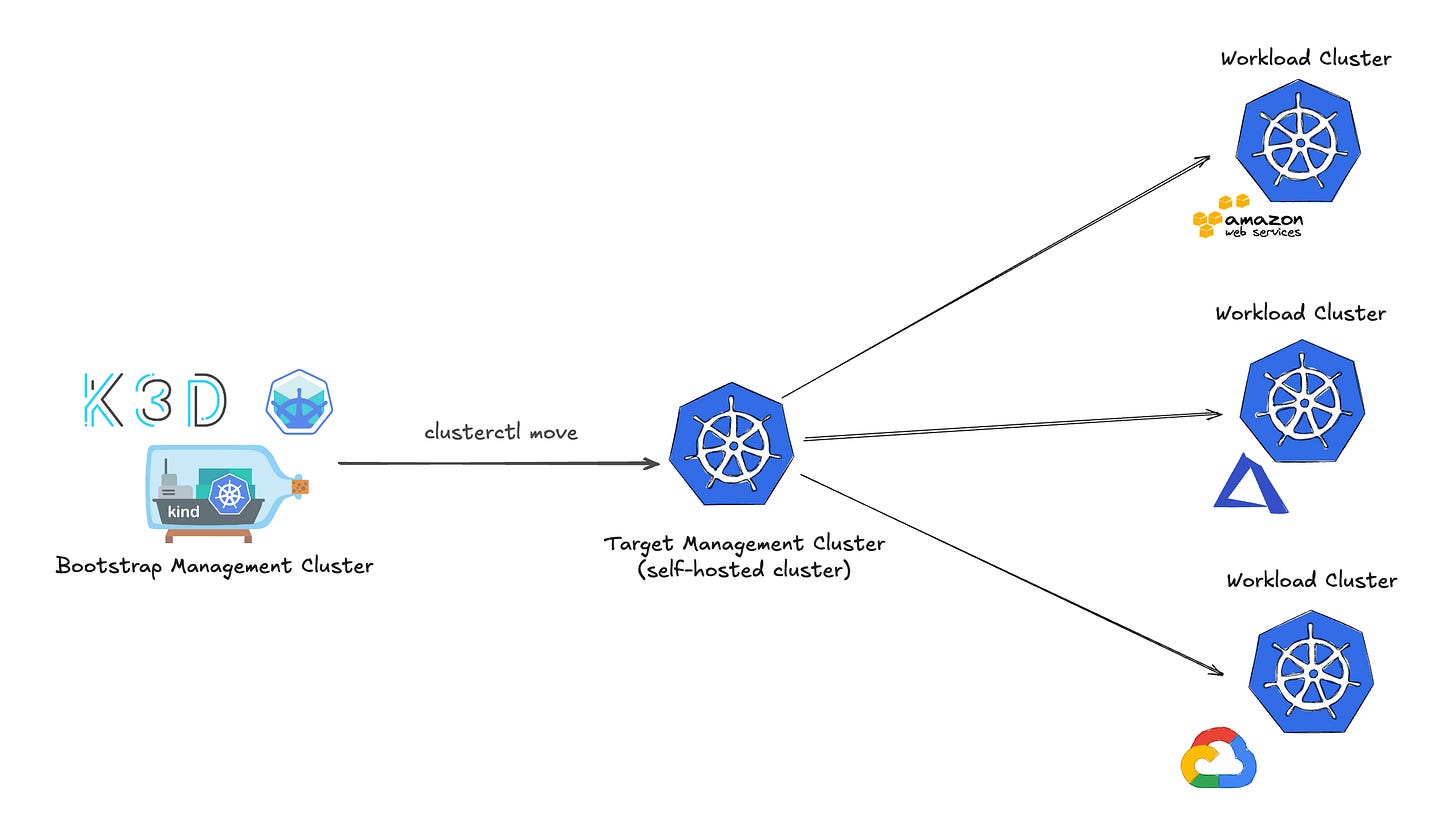 Cluster API provide us the ability to “move” Cluster API resources from one cluster to another cluster which means that we can make a “normal” k8s cluster become a Management Cluster just by giving it the Cluster API resources from another Management Cluster, this new Management Cluster still has the ability to manage the lifecycle of the provisioned Workload Clusters. With this information we can create a self-hosted cluster which is a cluster that acts as both the management cluster and the workload cluster. A self-hosted cluster manages its own lifecycle.